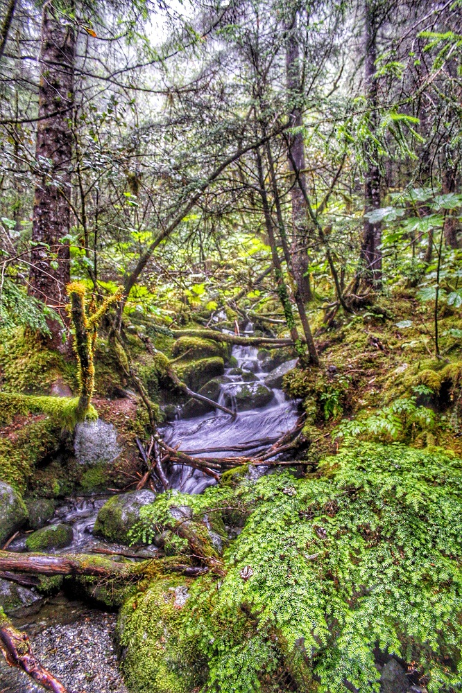 Next port was Juneau. The three of us booked an excursion to Mendenhall Glacier. It was a gray day with a light mist. Suzi and Cuz stayed in the dry, warm observation building and I decided to take a hike to Nugget Falls. Yes, I saw the sign that says “Bears. Travel in parties of two or more!”, however, I’m a fairly big guy so went for it. I thought I’d run into other hikers. I got involved looking at the scenery so missed the fork in the road for the falls.