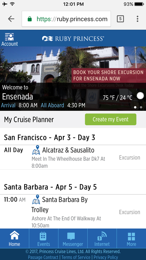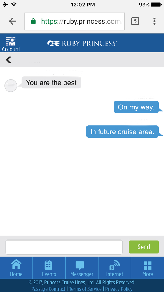 Once in Airplane Mode, connect to the Princess WiFi. Once connected, open up a browser, like Chrome and go to ship_name.princess.com, like ruby.princess.com.