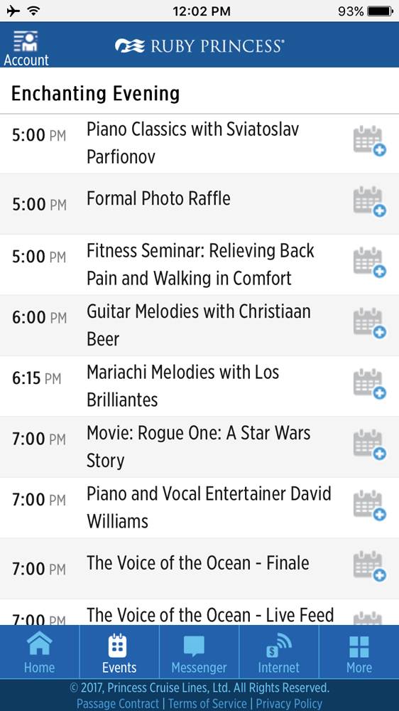 The Main Page will show excursions booked through Princess along with anything you wish to schedule, be it Specialty Dining, Bingo, Dance class, etc. To add an event, just click the plus sign in the calendar icon.
