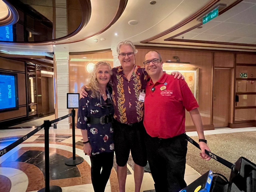 We met Tony outside the cruise terminal and got to go in through the Crew entrance. We “traded” in our Passports for our visitor badges, went through security and onto the ship.